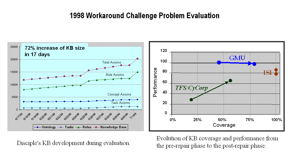During the first part of the HPKB program we developed the Disciple-Workaround integrated system that demonstrated a capability by which a knowledge engineer can rapidly build a knowledge base capturing knowledge from Military Engineering manuals. During the 17 days of DARPA's 1998 evaluation, the knowledge base of Disciple was increased by 72% with almost no decrease in performance (Cohen et al., 1998: The DARPA High-Performance Knowledge Bases Project, AI Magazine, 19(4), 25-49). The resulting workaround reasoner also achieved the best scores among all the teams that participated in the workaround challenge problem (see the 1998 Workaround Challenge Problem Evaluation).