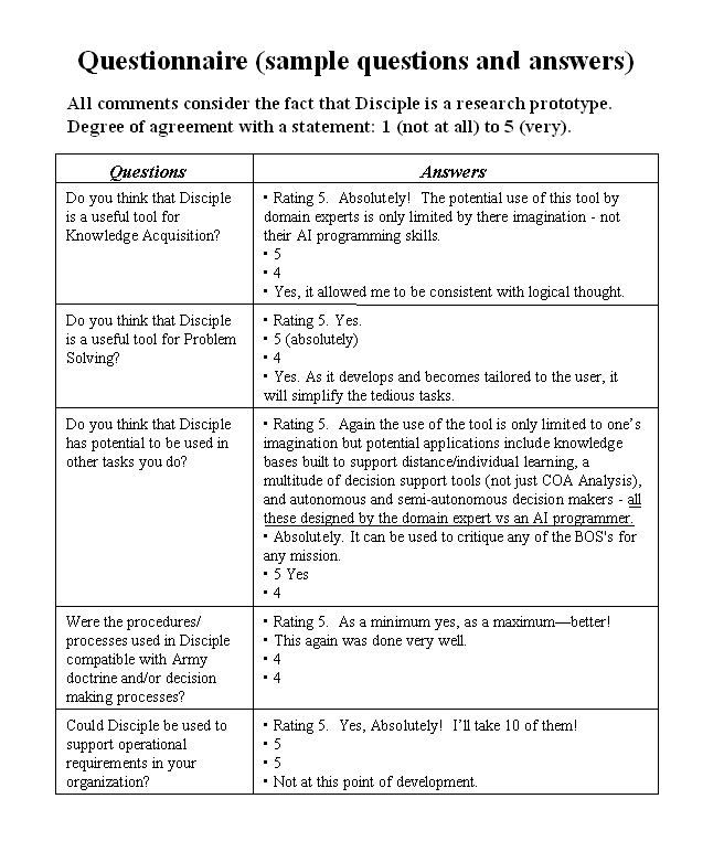 Disciple was successfully used in the "Military Applications of Artificial Intelligence" course at the US Army War College during the Spring 2001 session. An improved version will again be used in the Spring 2002 session of this course.