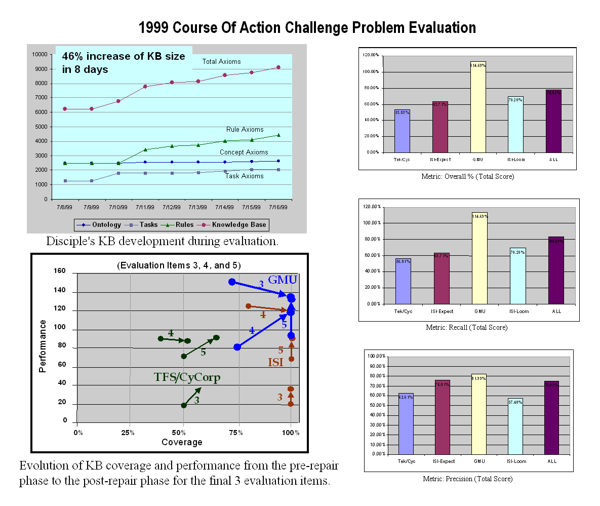 Four research teams participated in the DARPA's HPKB challenge problem called "Course of Action Critiquing": 1) A joint Teknowledge-Cycorp team, 2) The "Expect" research group from the Information Science Institute of the University of Southern California, 3) The "LOOM" research group the Information Science Institute of the University of Southern California, and 4) the "Disciple" research group from LALAB/GMU. Confirming the results obtained during the DARPA's 1998 evaluation, the GMU team distinguished itself by obtaining the best evaluation results among all the participating teams. Moreover, by receiving a score of 114%, it exceeded even the performance of the domain experts that performed the evaluation. This high performance was due to the fact that Disciple-COA was trained by a very competent expert and, as a result, generated many new solutions that were not anticipated by the evaluators. This is very significant because it demonstrates that a very knowledgeable expert can train Disciple to exhibit much of his or her expertise. During the evaluation, we again demonstrated a very high rate of knowledge acquisition, the knowledge base of Disciple increasing by 46% during 8 days (from a size of 6229 simple axioms equivalent to a size of 9092 simple axioms equivalent).