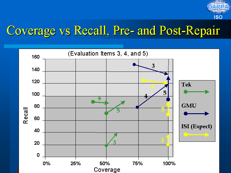 It is relevant to mention that these results were obtained by a GMU team that started as an "innovative technology component" team and ended-up building an integrated system by itself. For comparison, the other two teams that developed integrated systems for the Workaround Challenge Problem were the following: 1) ISI-SAIC (consisting of two research groups from the Information Science Institute of the University of Southern California and one research group from SAIC) and 2) TFS (consisting of a research group from Teknowledge and one from Cycorp).